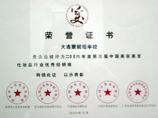 由“世界华人美容美发联盟”、:“亚太地区化妆业联合协会”、“中国国际品牌协会”、“中国百货商业协会”、“广东省美容美发化妆品行业协会”大型的机构评定:香港蒙妮坦大连美容美发学院荣获杰出经销商的称号。